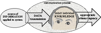"The continuous conversion of knowledge into information and information into knowledge is key element of what companies must do to develop and apply knowledge successfully." In this case receiver of information is considered to be the human and information as structural changes within the human nervous system that correspond to the persons interactions with his or her environment . If we accept Varela's notion of information (see above) we must accept its character resulting from this interaction. Thus too, the meaning of the received information depends on the changeable and self-organizing structure(s) of the nervous system. This again becomes inherently circular, or better recursive, as the structures of the nervous system itself evolves according to the character of what is considered information or knowledge. In this sense human information has a nature analogous to the phenotype as both result from a unique person's interaction with his or her environment. The dynamic character of such internal information is often connected with the concept of knowledge, and knowledge is seen as the basis for generating ideas about potential future states of the world and adequate kind of actions. To stress dynamical character of knowledge many authors (for example Gordon Pask [Reference!] ) prefer to specify a procedural notion of "knowing" (also "observing: and/or "distinguishing"). For the moment I will speak of knowledge as "internal information" that corresponds to a cognitive process in contrast to an externalized form which I have referred to as "conceptual information". Thus knowledge (as-internal-information) is a name used by an external observer to refer to particular dynamics in the immensely changeable structure of the nervous system. The character of such knowledge, as well as the conceptual information or actual behavior which it gives rise to depends not only on the information received, but also on the structures of the nervous system at the moment that the information is received, in the other words on "previous knowledge". Maturana and Varela [1987] have emphasized the organizational closure, structural determination and plasticity of the nervous system which enables such a flow of structural changes that conserves coherence with the flow of changes in the environment (structural coupling). The notions inherent in complex systems theory suggest similar features for the nervous system. According to this theory the nervous system is an extremely complex system which has the essential ability of self-organization while its states (structures and processes) depend on former states. Its states fluctuate around various "patterns" of dynamical equilibrium while at the same time the system's processes are very sensitive to internal fluctuation and external perturbation. In this way internal structures and associated cognitive (mental) processes on the one hand have a tendency to retain some patterns while on the other hand they have an immense ability to form new dynamic structures (formulate ideas). To understand the nature of knowledge better we can use Miller's idea that a complexity of internal information processes are needed for survival of living systems. Miller [1978] distinguishes three types of information: