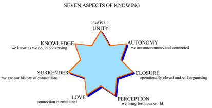 Towards wholeness These strivings towards creating conditions in which we humans can express the best that is in us, viz that we are intelligent, creative, adaptive and meaning seeking, are happening in many places. For the latent potential is all there. Harrison Owen, in a posting on the Open Space listserv said: "Creating an environment in which people can be fully themselves ("Just live") is indeed a major contribution. I think that is what we do [as facilitators of OST gatherings]. But the point is we can't give them what they already have. However, we may give them an insight to the gifts they already have, should they choose to use them." I believe this striving reflects "a commitment to life and to each other. Like all life, we pursue a direction only towards wholeness ....." Wheatley & Kellner-Rogers, in A Simpler Way (Berrett-Koehler). And, as mentioned earlier, I believe also that the work of Humberto is showing us how we as a species can better understand how what we choose to notice creates the worlds we live in. A masterly synthesis, in my opinion, on this growing 'science of wholeness' based on Humberto's ideas has been written by Lloyd Fell. Entitled "Seven Aspects of Knowing, Quality of Life for Individuals and Organisations, A contribution to the science of wholeness" it is an expression of very practical ways - with a touch of the feminine - through which we can come to appreciate the essence of our humanity as 'whole' creatures. And of the 'blind spots' which prevent us from realizing more of our innate potential. A diagrammatic representation is given here. The article can be found at www.pnc.com.au/~lfell/